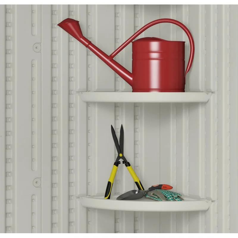 4 petites étagères de coin sont offertes avec l’abri Woodgrain Suncast.