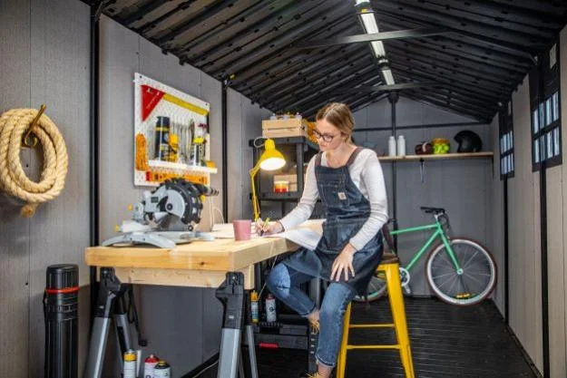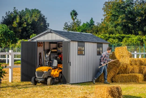 Abri de jardin en résine effet bois avec double porte et fenêtres, système d’aération, cadenassable.