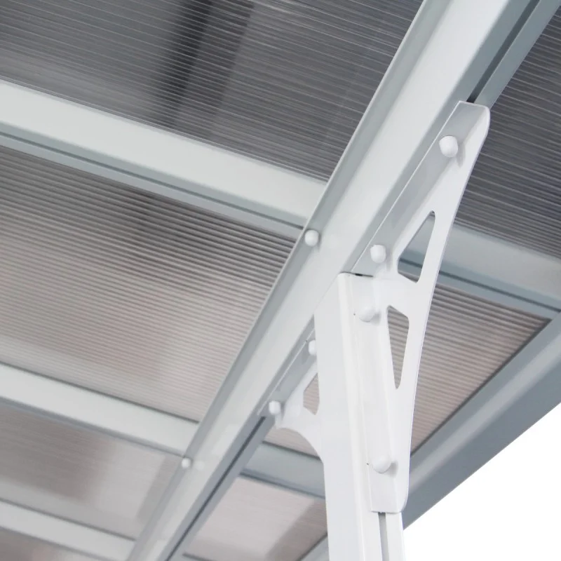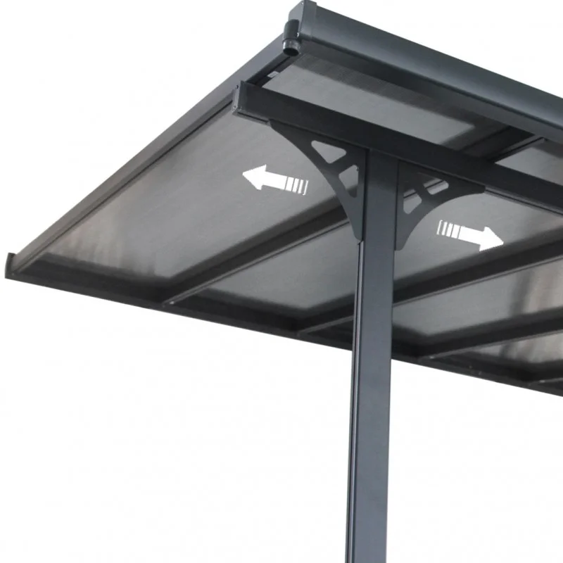 Les panneaux solides en polycarbonate alvéolaire transparent de 6mm bloqueront le rayonnement UV nocif, et ils garderont un aspect impeccable durablement. Ils ne craignent ni chocs, ni impacts, et un système intégré de gouttières à l’avant déviera la pluie sur les côtés, où des connecteurs d’angles peuvent se raccorder à des descentes d’eau, pour la récupérer ou la canaliser.