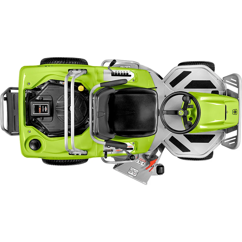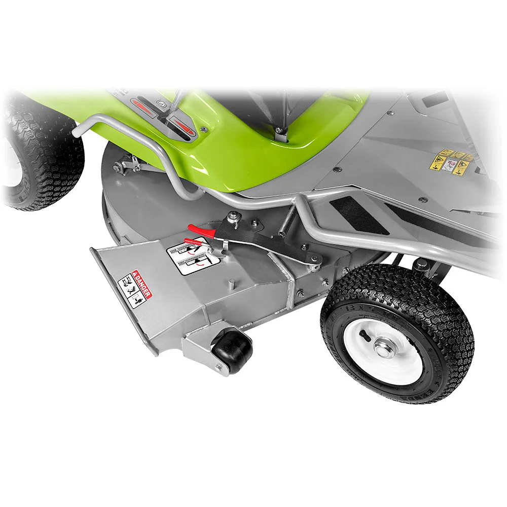 La hauteur de coupe va de 2,5 à 8 cm et s’effectue au moyen d’un levier à 6 positions. Ce même levier dispose d’une position de transfert supplémentaire qui permet de soulever l’ensemble du dispositif de coupe du sol, en arrêtant automatiquement la rotation des lames pour franchir aisément les bordures et les obstacles.